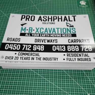 High-quality custom corflute signs that are both cost-effective and quickly produced. Ideal for any signage needs, offering lightweight yet durable solutions for both indoor and outdoor use. With vibrant, full-color printing and fast turnaround times, our corflute signs are perfect for promoting your business, guiding guests at events, advertising real estate properties, and much more.